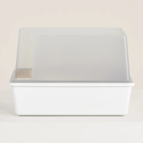 Cubby is a modern litter box designed to keep messes contained and floors protected. Removable 8-inch walls help prevent litter scatter and overspray, while semi-transparent sides provide visibility so cats feel comfortable. The open-top design allows easy access for cats of all sizes. Made from durable, odor-resistant plastic that is easy to clean.